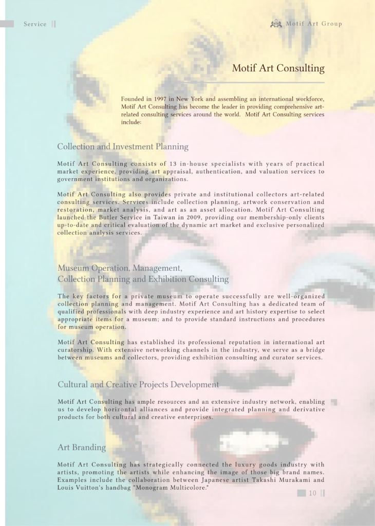 Founded in New York and registered in the State of New York, the State of New Jersey, the State of Delaware, and the Cayman Islands in 2003, Motif Art Management has created a bridge between art and finance, guiding our clients, both individual investors and institutions, in developing portfolio management strategies to achieve their financial goals. Motif Art Management services include: